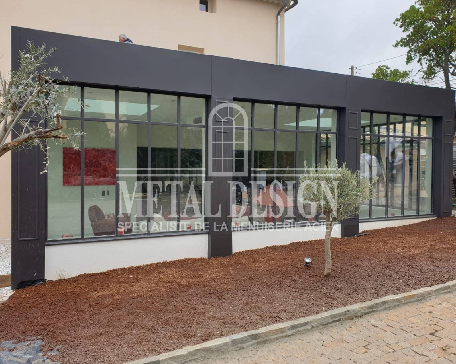 Nous avons fabriqué et installé les menuiseries en acier à rupture de pont thermique. Les parties maçonnées ont été habillées de tôles décoratives.