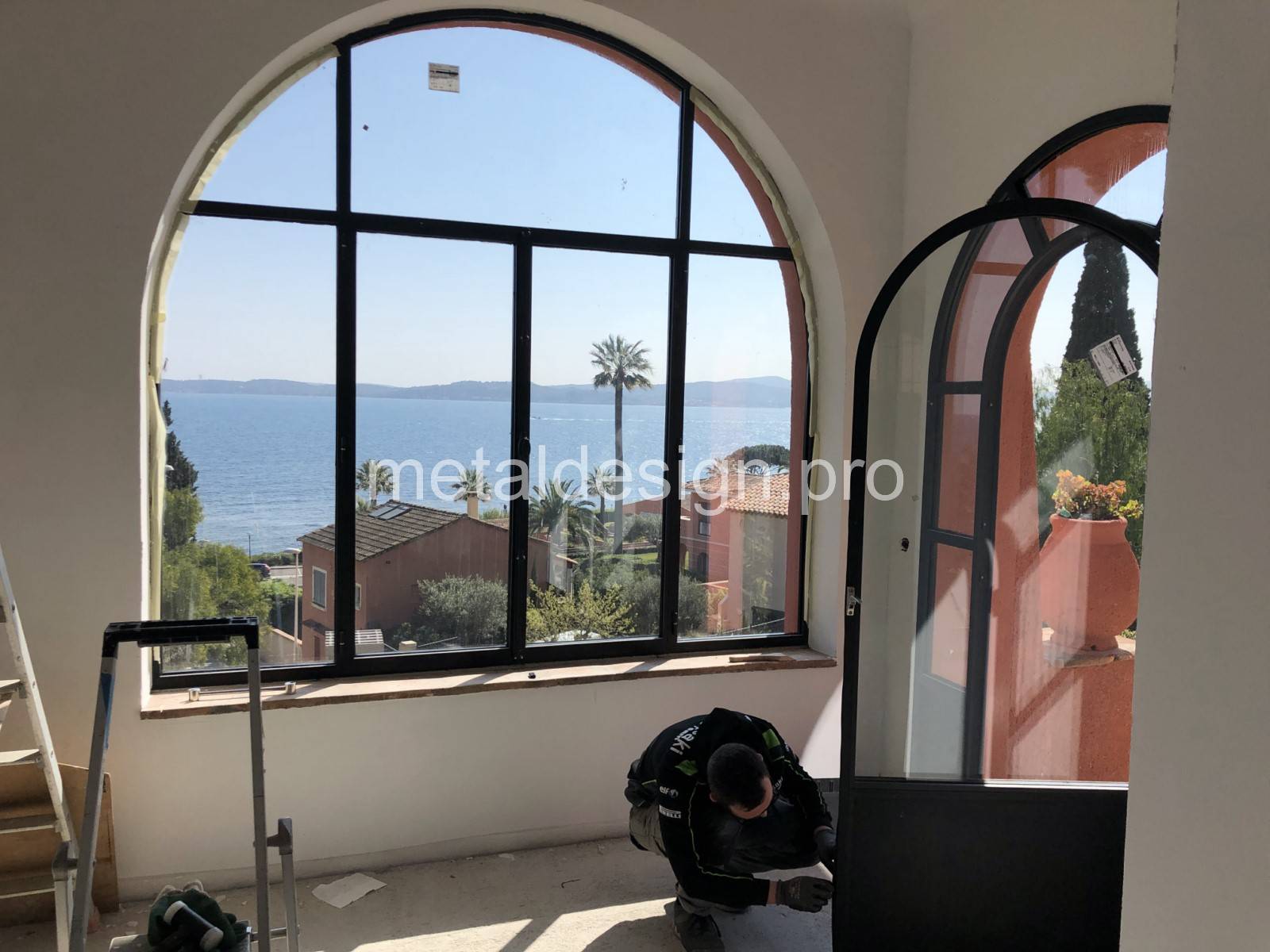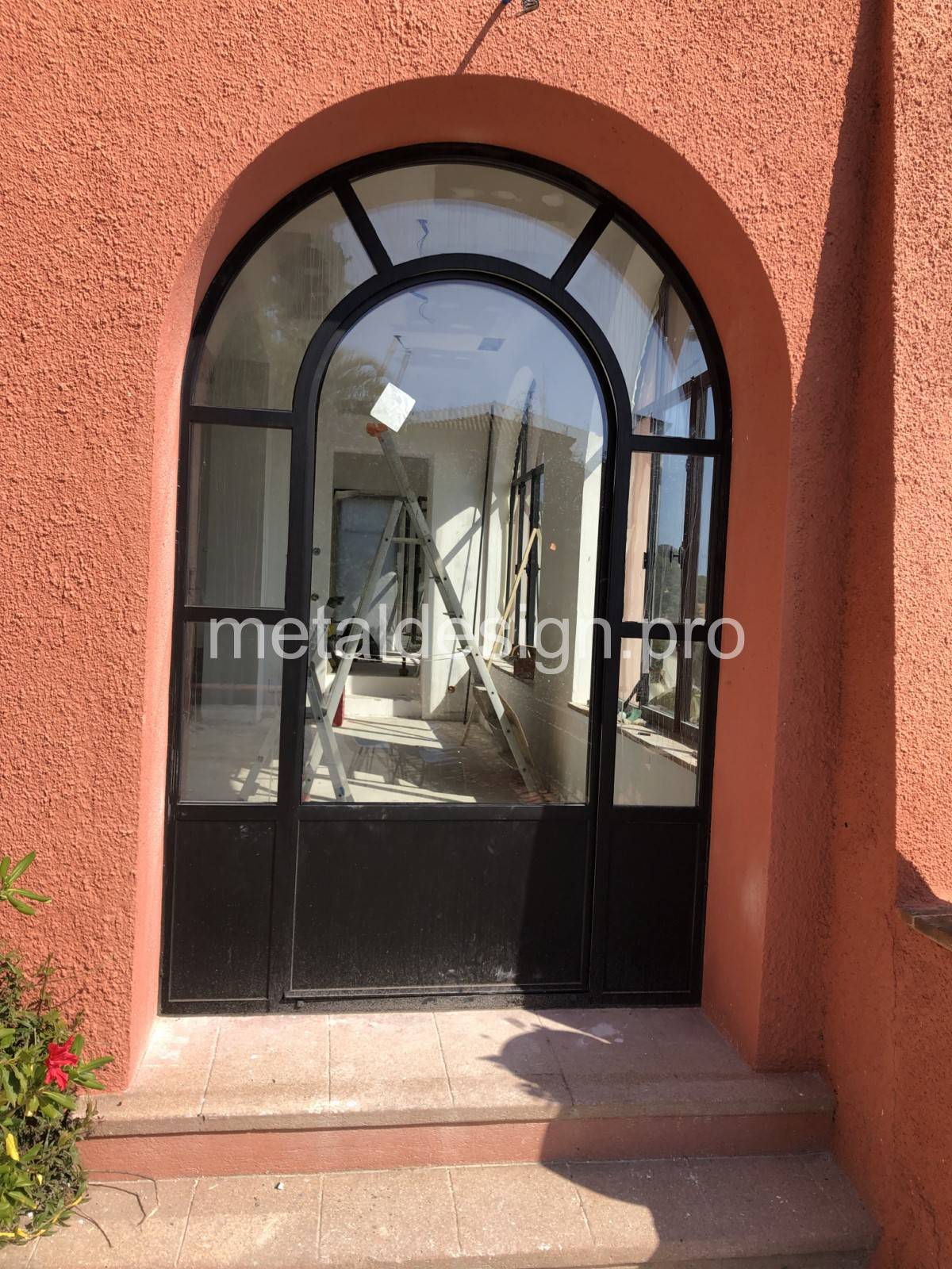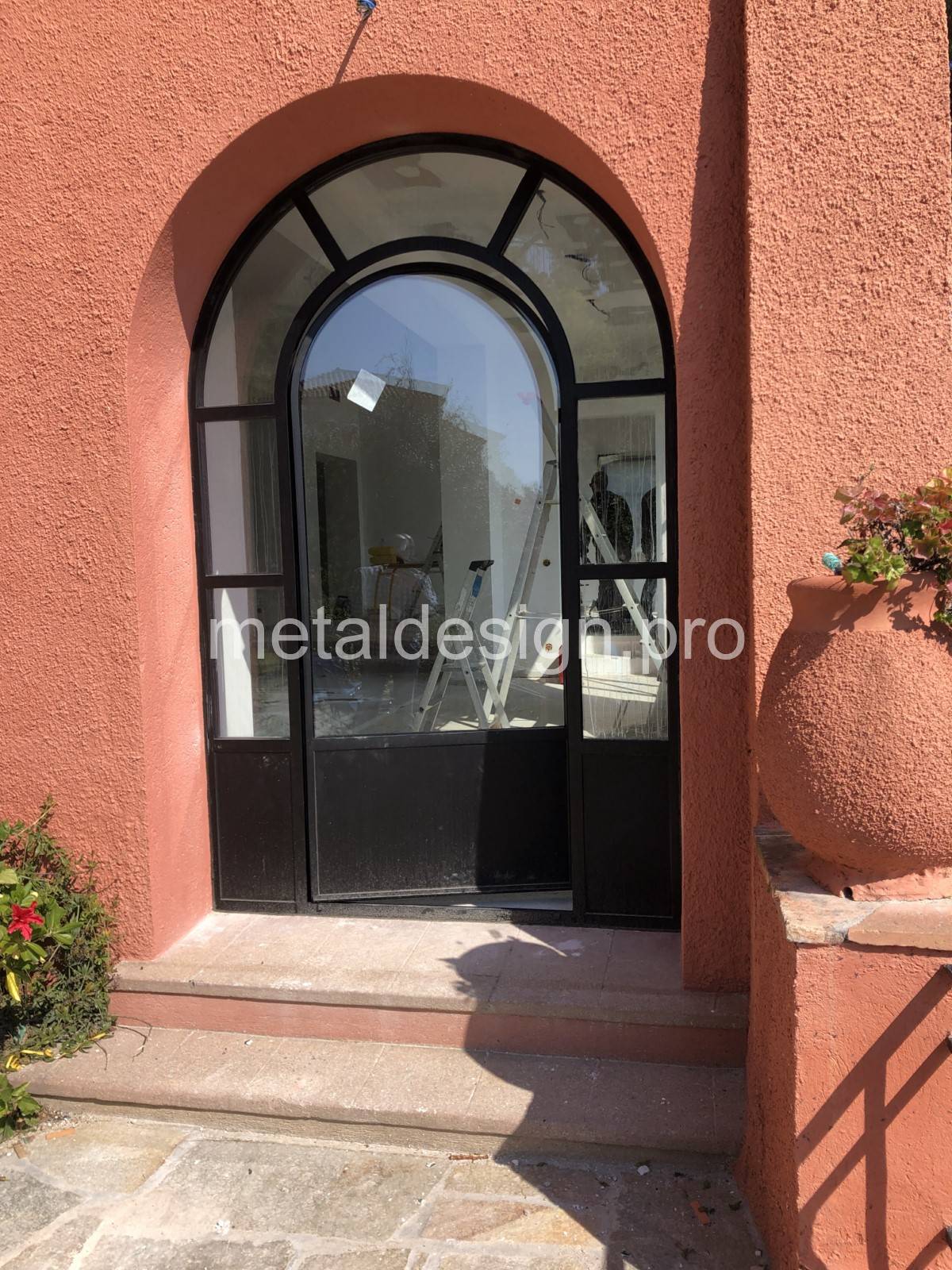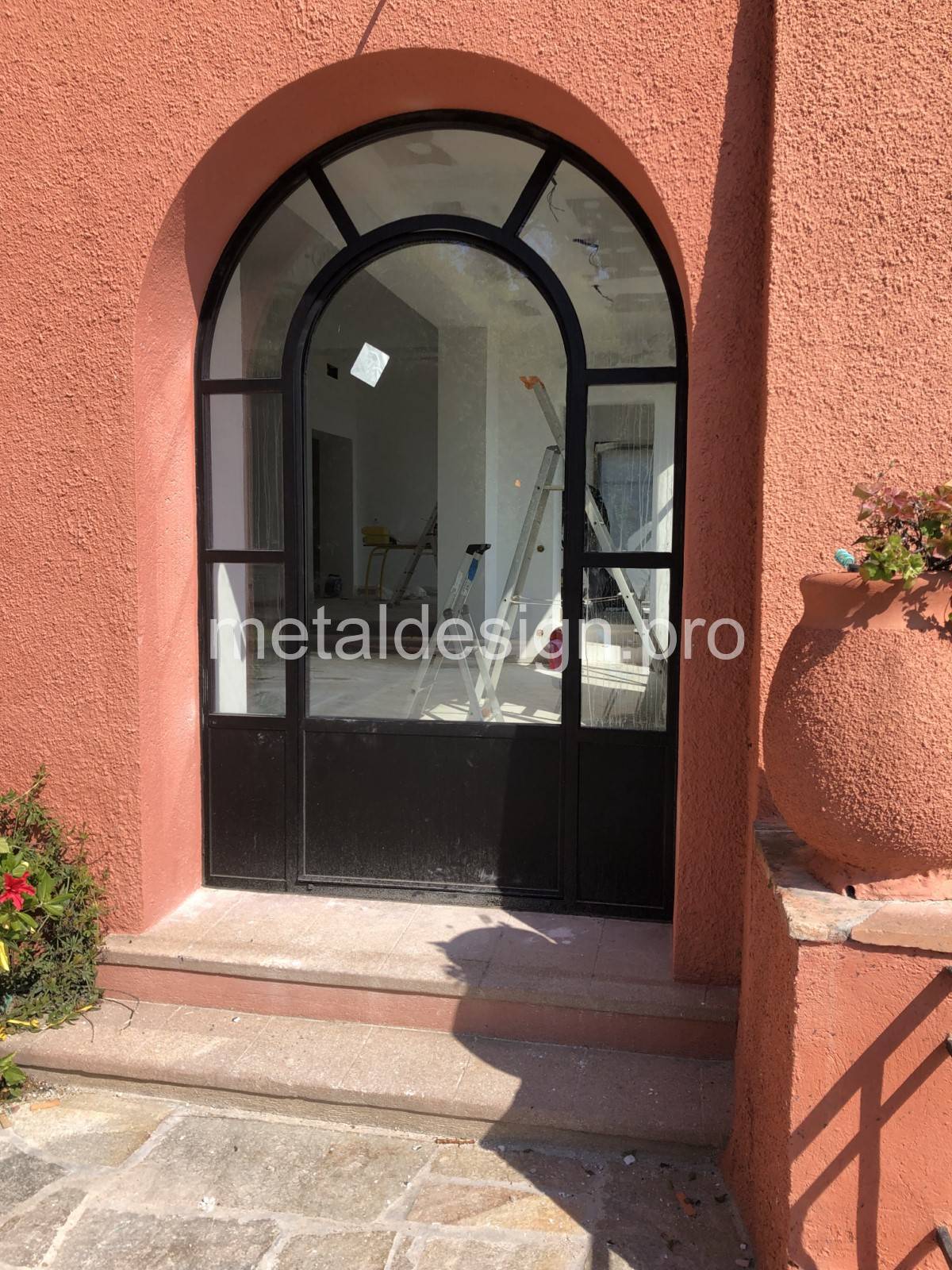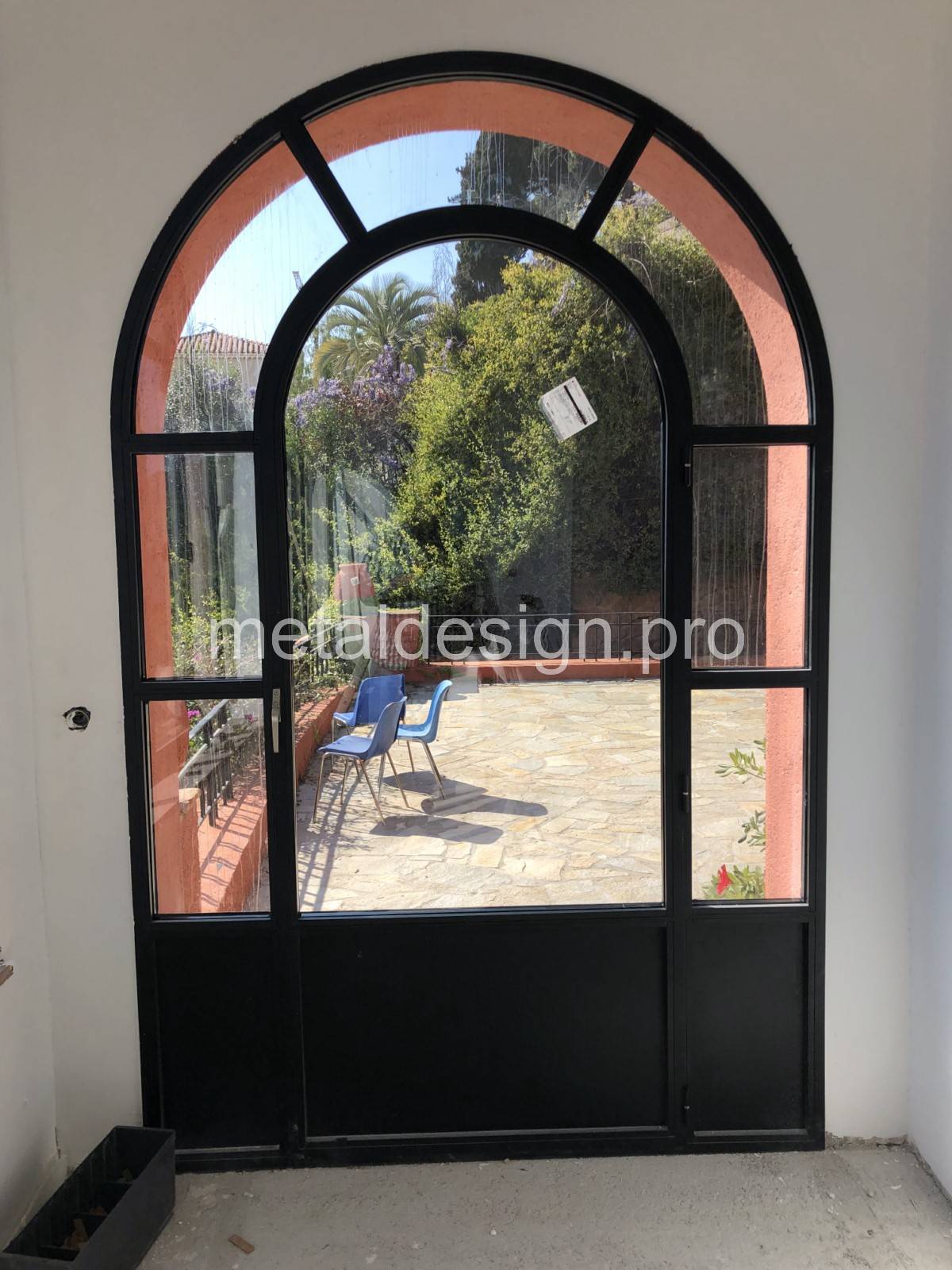 Cette porte plein cintre, ornée de rayons, fait partie d'un ensemble de menuiseries que l'équipe de Metal Design a fabriqué à Salon-de-Provence dans les Bouches-du-Rhône et posé à Sainte-Maxime dans le Var.