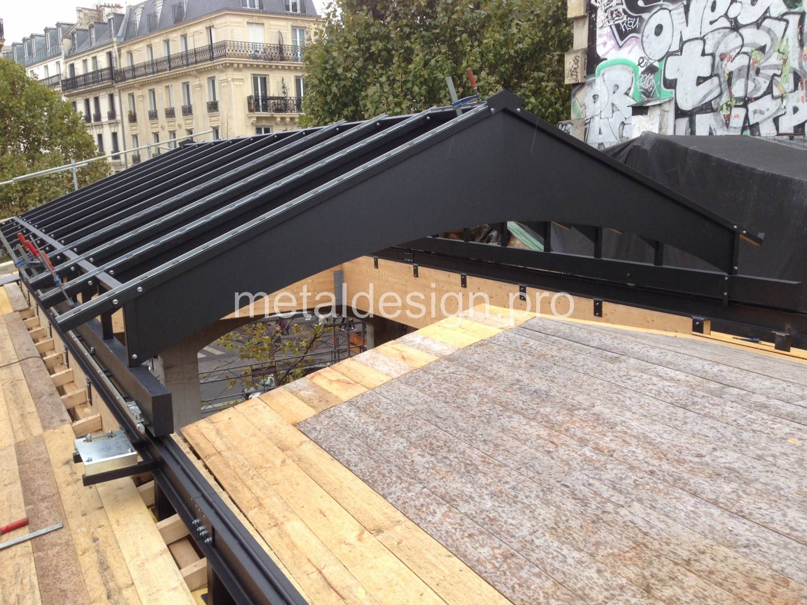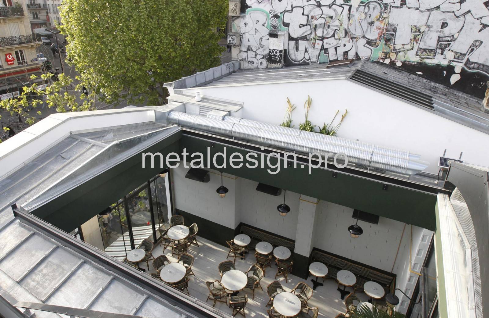 Métal Design a réalisé la structure de la verrière de toit en acier dans son atelier à Salon-de-Provence. La structure de trois tonnes a traversé la France en camion et a été hissée sur les toits par grue. Une fois installée, la verrière escamotable coulisse en une minute et ouvre la salle de restauration pour en faire un patio.